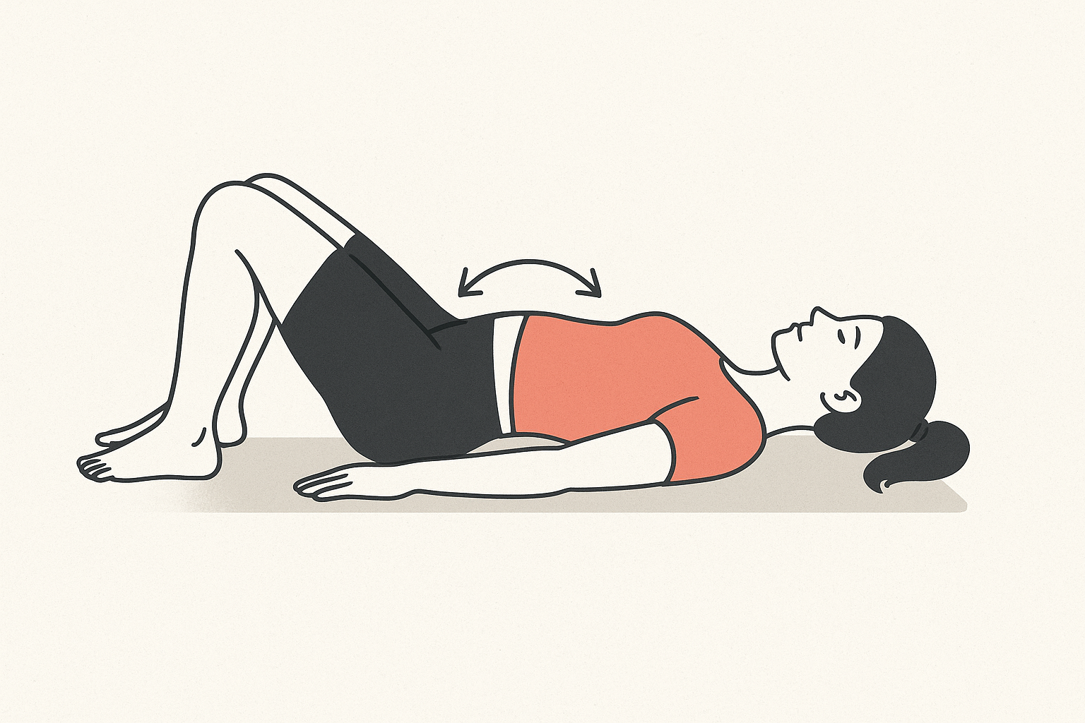 Ejecución: Realiza una inclinación pélvica suave hacia adelante y hacia atrás, aplanando y arqueando la zona lumbar contra el suelo.