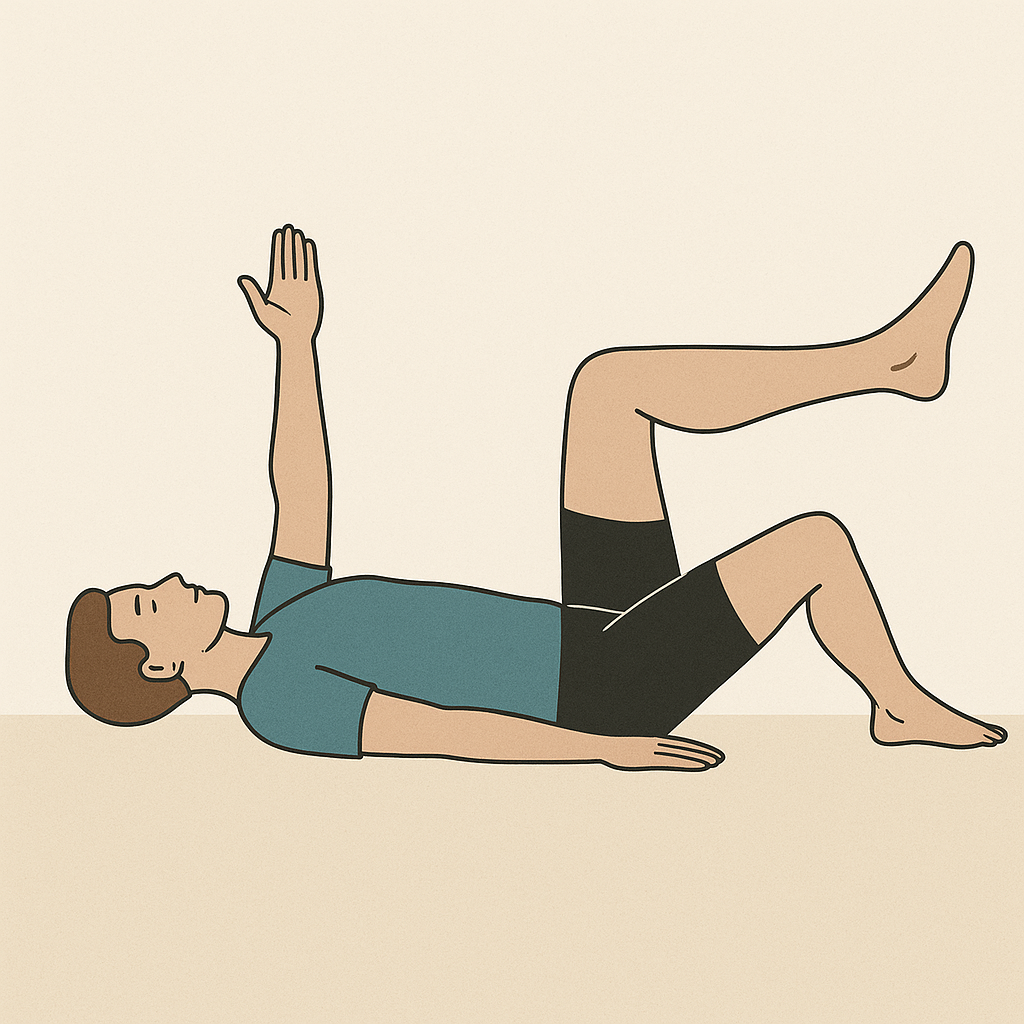Posición inicial: Acuéstate boca arriba en una superficie cómoda, con las rodillas flexionadas y los pies apoyados en el suelo, alineados con las caderas..