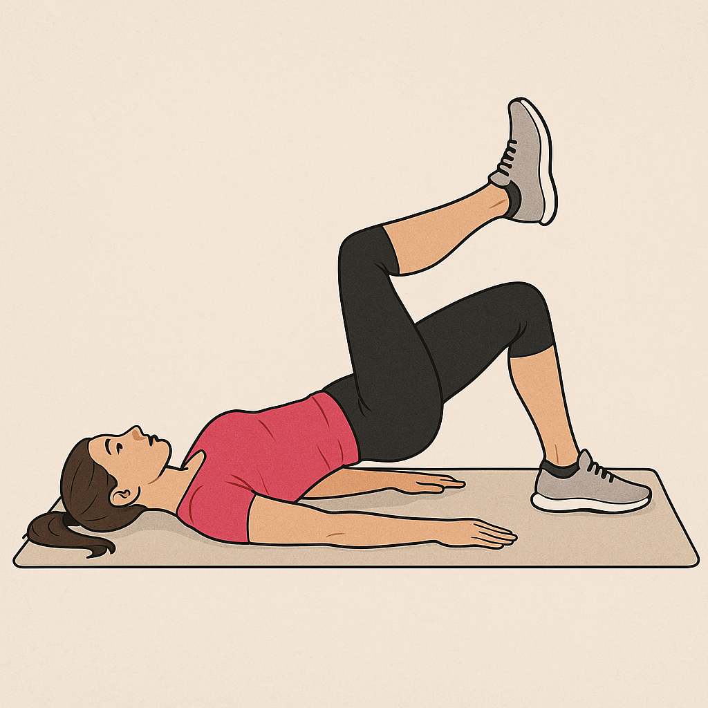Ejecución: Activa los músculos del core y los glúteos para elevar la cadera hasta formar una línea recta desde los hombros hasta las rodillas. Mantén la posición elevada y, sin bajar la cadera, levanta una pierna flexionando la rodilla hacia el pecho, luego bájala y haz lo mismo con la otra pierna. Mantén el abdomen contraído y evita que la pelvis se desplace o se incline. Respira de manera controlada para mejorar la estabilidad.