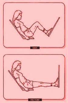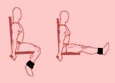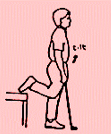 Isquiotibiales (para que haya un l equilibrio entre el cuadriceps y los isquiotibiales) acostado sobre su espalda con las dos piernas en una silla o banco, caderas y rodillas en ángulo recto, las manos apoyadas en el suelo para mantener el equilibrio (primero con base amplia y después más estrecha a medida que tenga mas fuerza.) Levante un pie de la silla y crúcela por encima de la otra pierna, esforzándose por mantener una línea recta desde la rodilla hasta los hombros. Sea conscientes de la pelvis y asegúrese de que su cuerpo no se inclina a un lado cuando se levante. Mantener el cuerpo separado del suelo y contratar los oblicuos y la parte lumbar de la espalda también. | Elevar la pierna recta: Acuéstese sobre su espalda con la rodilla estirada y en el suelo. Mantenga la otra pierna flexionada con el pie en el suelo. Lentamente levante la pierna a unos 15 cm. del suelo, manteniendo la pierna tan recta como le sea posible. Sostenga la posición durante unos 5 segundos, y luego bajarla lentamente. Repita este ejercicio 6 veces sobre una superficie dura, al menos 4 veces al día. |