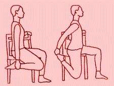 6. Fortalecimiento del adductor de la cadera. Mientras está sentado apriete una bola de caucho entre sus rodillas. Mantenga la presión durante 5 a 10 segundos. Haga el ejercicio de 5 a 10 veces. (Si usted no tiene una bola coloque sus manos o sus puños entre sus rodillas y luego apriete). | 7. Fortalecimiento del abductor de la cadera (mostrado en al lado izquierdo, vista frontal y lateral). Colóquese como se muestra, de pie en su pierna izquierda con la rodilla ligeramente doblada. Lentamente levante el pie derecho unos 30 grados, mantenida durante unos segundos y luego baje lentamente el pie y estire ambas piernas. Haga el ejercicio 10 veces. No permita que su pelvis se doble (tuerza), y no deje que sus rodillas viren hacia adentro mientras las tiene dobladas. |