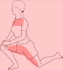 Estiramiento de cadera y nalga (mostrado al lado izquierdo). Colóquese como se muestra, con la pierna izquierda sobre la pierna derecha y coloque sus manos sobre su rodilla izquierda. Tire de la rodilla lentamente hacia su cuerpo mientras permanece sentado muy rectamente. mantenga la posición durante 20 segundos y luego descanse durante varios segundos. Haga el ejercicio 6 veces. | Estiramientos flexores de cadera. En posición de pie, avanza una pierna en ángulo recto y retrasa la otra extendida. Poco a poco se baja la cadera sintiendo un estiramiento suave, en la parte frontal de la cadera, en los tendones de la corva y en la ingle. Una variante es estirando el pie de la pierna retrasada. Nunca se debe adelantar la rodilla que hace ángulo recto. |