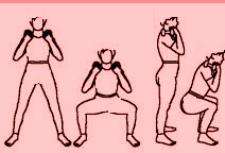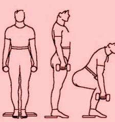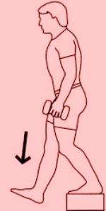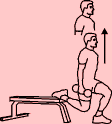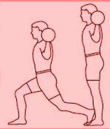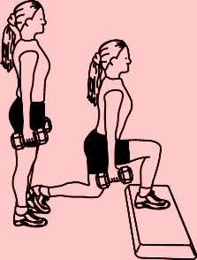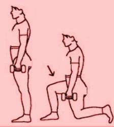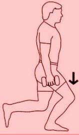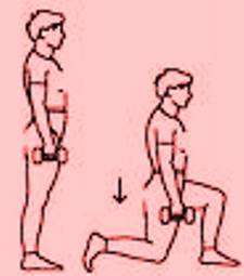 Estocada hacia adelante. Estando de pie dar un paso hacia adelante con la pierna lesionada, flexionar 90º la rodilla de la pierna adelantada, apoyándose en el pie de la pierna adelantada, al mismo tiempo, descender la rodilla retrasada asta 6-7 cm. del suelo, a continuación volver a ponerse de pie. Cambiar de pierna. |