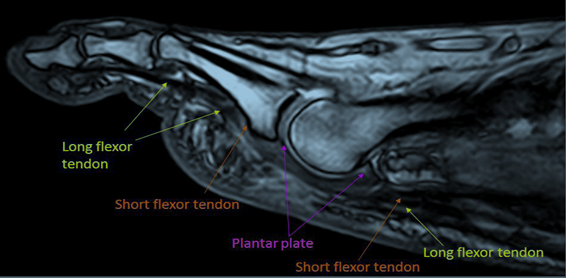 La resonancia magnética es una buena alternativa a la artrografía cuando exista ruptura de la placa plantar ya que es una técnica no invasiva. Mediante esta técnica, la zona se observa con una señal más intensa, que se extenderá más allá del área inmediata de la inserción de la placa en la base de la falange proximal.