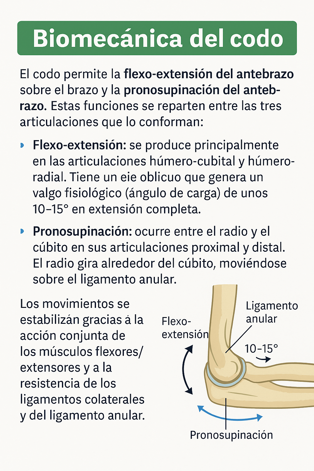 - Flexo-extensión: se produce principalmente en las articulaciones húmero-cubital y húmero-radial. Tiene un eje oblicuo que genera un valgo fisiológico (ángulo de carga) de unos 10–15° en extensión completa.